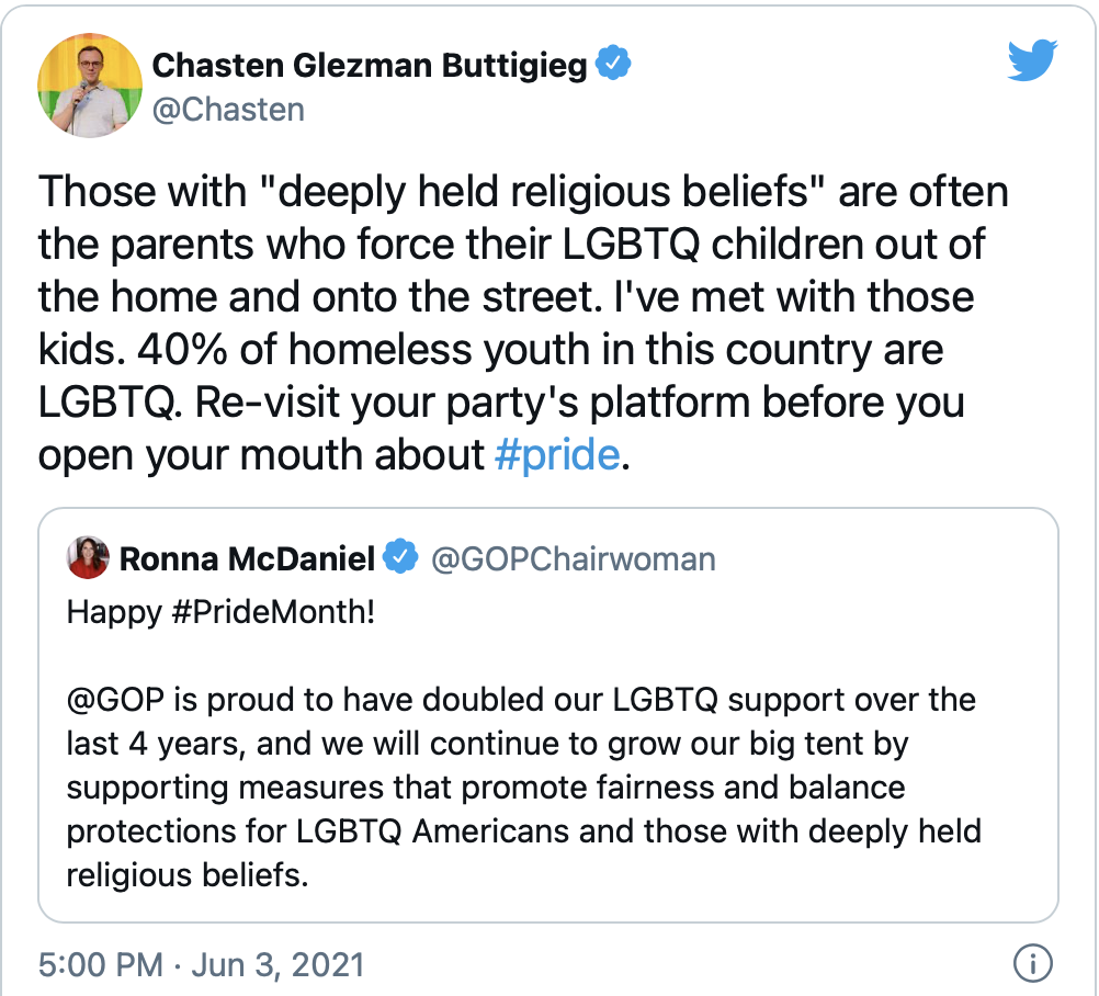 Seems that Miss Liar Liar Pants On Fire wants to help my LGBTQ+ community celebrate Pride by reminding us of all the awesome-sauce things her organization is doing for us. Great! But people ain't having none of it, especially Chasten B. As reported over at Towleroad.com, he responded to McDaniel's tweet in "support" of Pride month with the following: