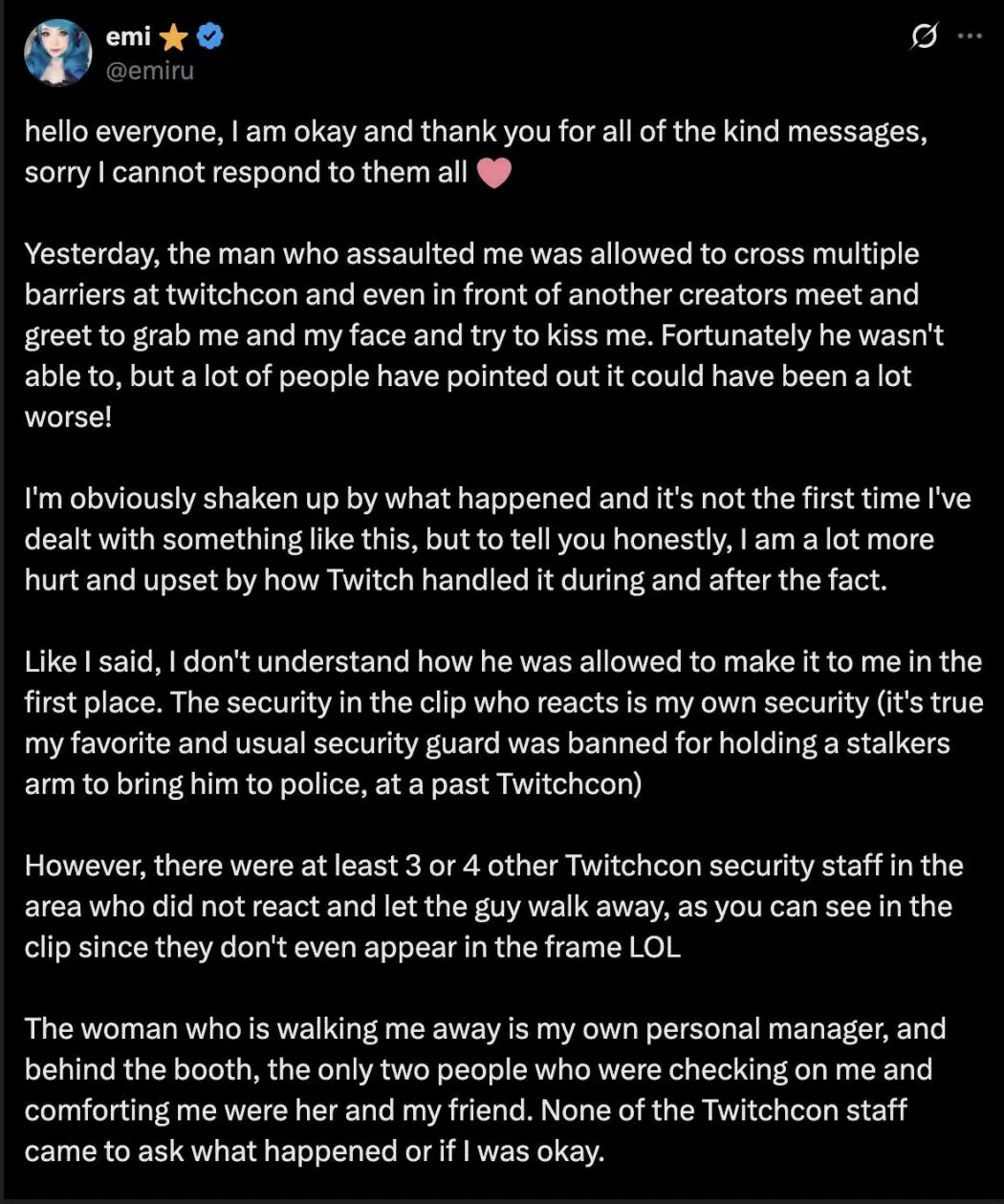 According to Emiru’s team, Twitch told her the perpetrator would be banned from the platform for just 30 days. This was not a case of online harassment or TOS violations. This was an assault on a platform-paired creator at Twitch’s own in-person event. That Twitch initially responded with less urgency than they would for a chatroom spammer says everything about where their priorities lie.