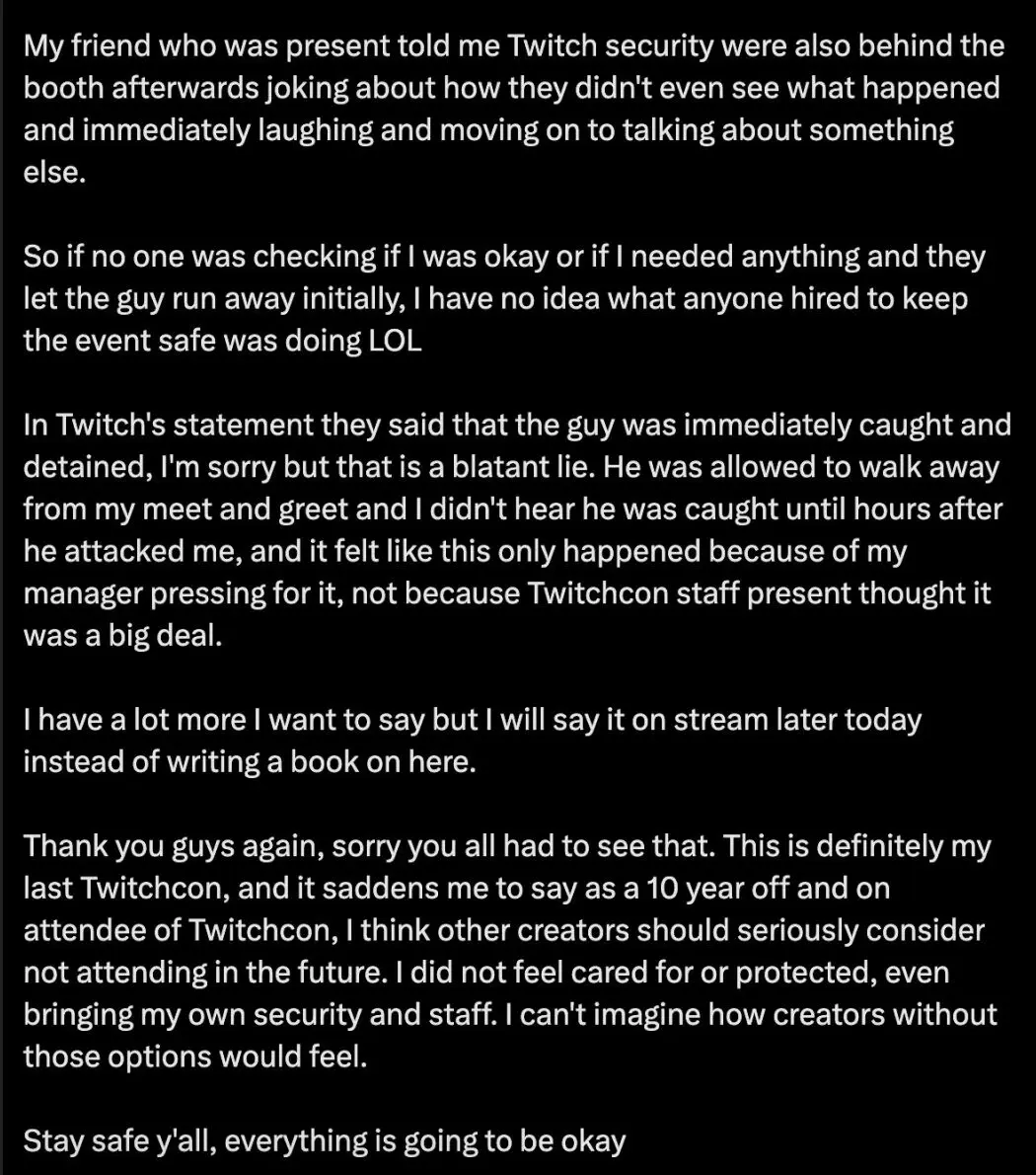 Her security team responded right away. TwitchCon’s security team, however, did not. In fact, multiple reports allege that TwitchCon staff were seen laughing and dismissing the situation, allegedly noting that nobody even saw him get close to her. Not only was the moment mishandled in real time—it would later be mishandled again by the platform itself.